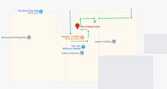 The main entrance is through Square 1 Coffee, past the bathrooms, into "Hive 1" and down the hall to office #5.